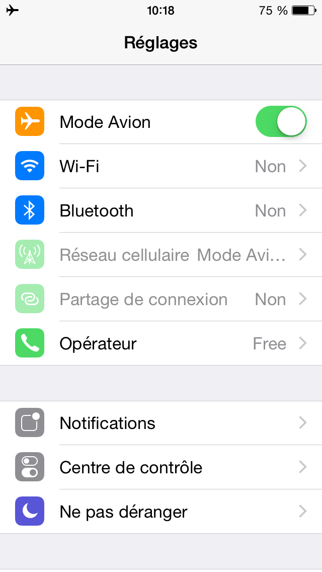L’utilisation de votre iPhone est interdite en avion, ainsi que pour tout autre téléphone. Les constructeurs ont inclus dans leurs systèmes, la possibilité que vous puissiez utiliser votre téléphone, avec le mode avion. Cette option coupe, les connexions cellulaires, le Wi-Fi et le Bluetooth.