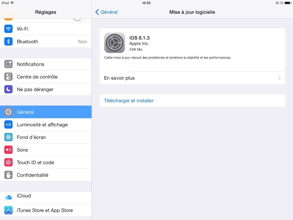 Appuyez sur le menu Général puis sur Mise à jour logicielle. Lorsque la mise à jour s’affichera, appuyez sur Télécharger et installer. Vous pouvez faire autre chose avec votre iDevise, pendant le téléchargement des fichiers.