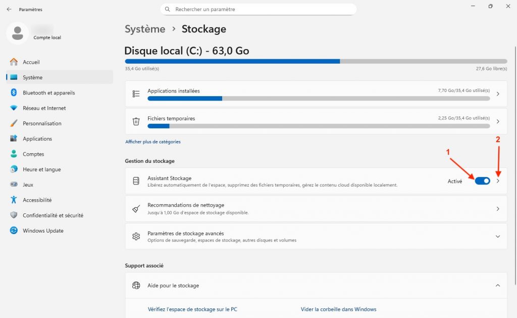 Sur la ligne Assistant Stockage, cliquez sur le bouton (1) pour l’activer. Ensuite sur la même ligne, cliquez sur la petite flèche qui va vers la droite (2), pour faire apparaître les différents réglages.
